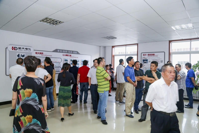 會議結(jié)束后,全體與會代表乘坐大巴來到山東哈大電氣有限公司八角工業(yè)園廠區(qū)考察指導(dǎo),圖為與會代表正在榮譽(yù)資質(zhì)展示廳了解哈大電氣的發(fā)展沿革、資質(zhì)、榮譽(yù)、典型工程等基本情況。