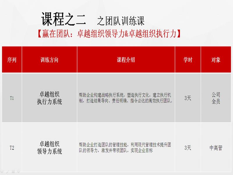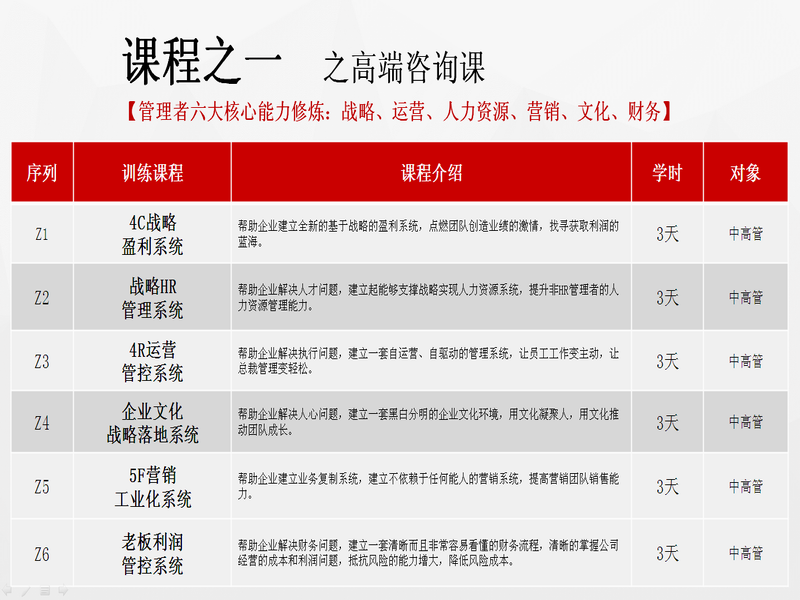 截止目前公司已經(jīng)參與了《高管財商》、《戰(zhàn)略管理者五項修煉之戰(zhàn)略人力資源系統(tǒng)》、《戰(zhàn)略管理者五項修煉之企業(yè)文化戰(zhàn)略落地系統(tǒng)》、《企業(yè)倍增盈利工程之**組織領(lǐng)導(dǎo)力系統(tǒng)》的小 范圍學(xué)習(xí)。